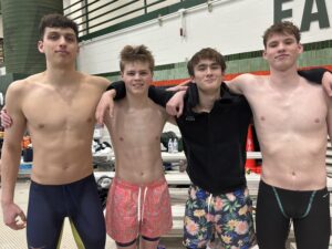 Pictured left to right: Richmond, Baird, Defina, and Robertson placed 11th in the 200-yard freestyle relay with a time of 1:30.31.